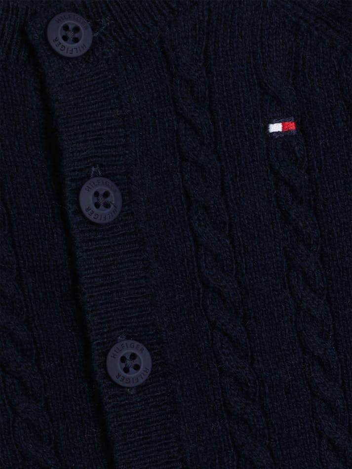 This cosy coordinating set includes a beanie, cardigan and trousers, each made with soft wool to a classic cable-knit design.