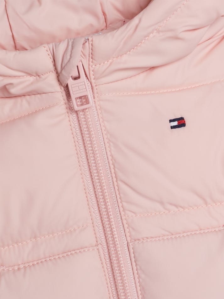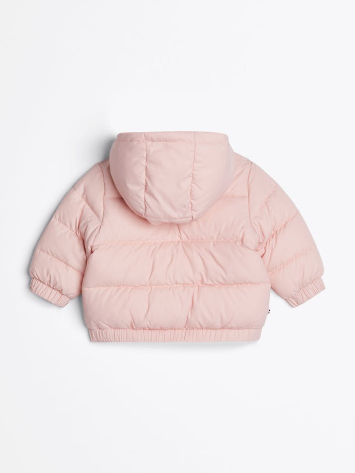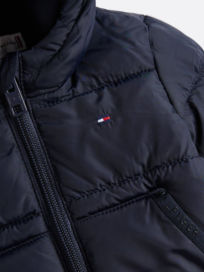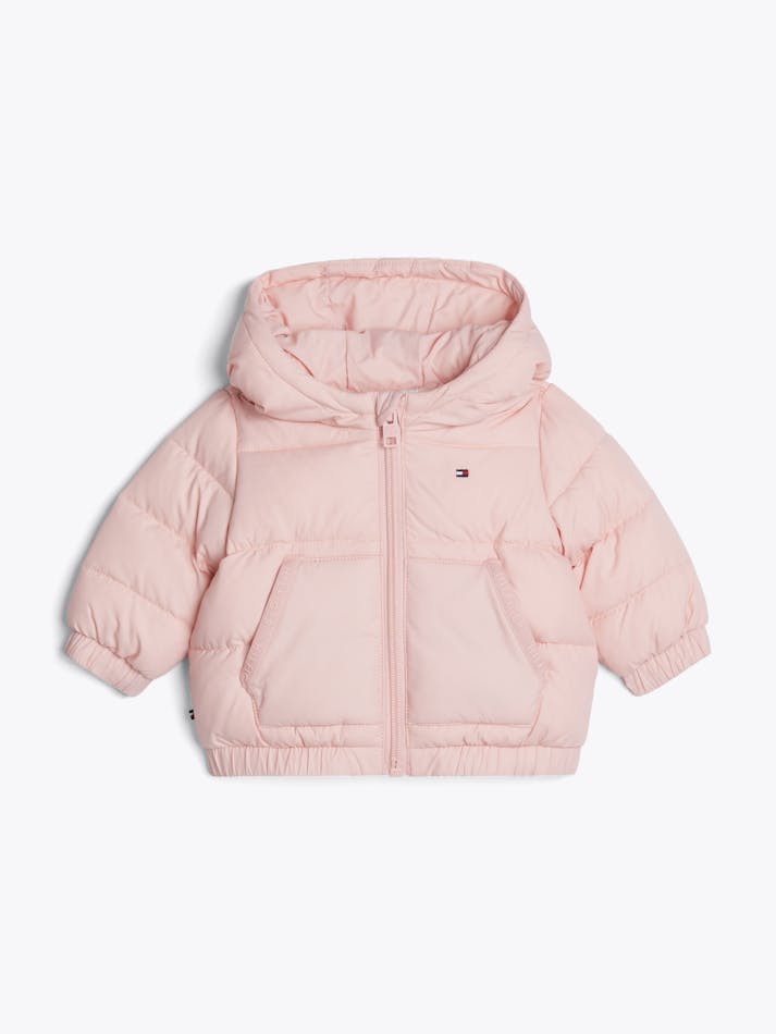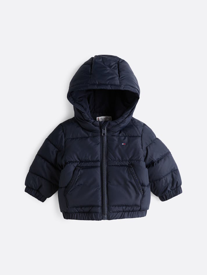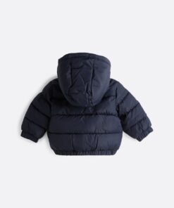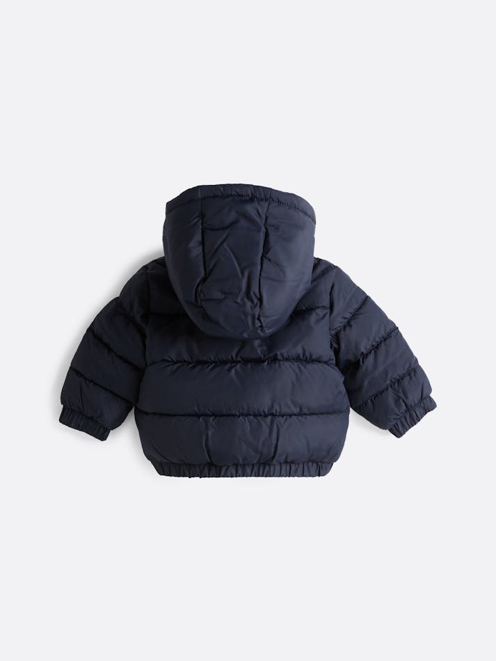 This zip-thru puffer jacket will keep baby feeling ultra cosy, thanks to its hooded neck and snug padding.