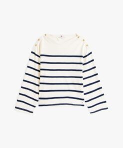 The boat neckline on this long-sleeved top is complemented by gold-tone buttons, adding a touch of nautical-inspired charm.