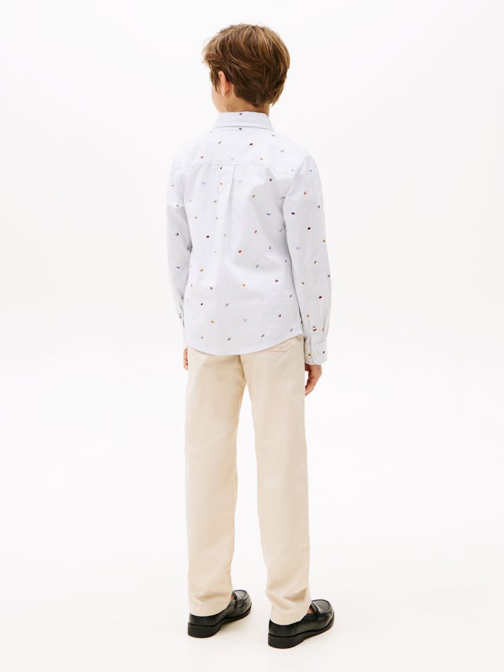 A fun and playful shirt for kids, this stretch cotton design pairs a smart button-down front with a charming all-over stripe and flag print.