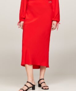 Make an entrance at special events in this maxi skirt cut from drapey fabric and elegantly enhanced with branded hardware.