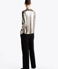 Make an entrance with this metallic lame shirt. Its sleek design is elevated by the pleated details on the front and enamel flag plaque on the cuff.