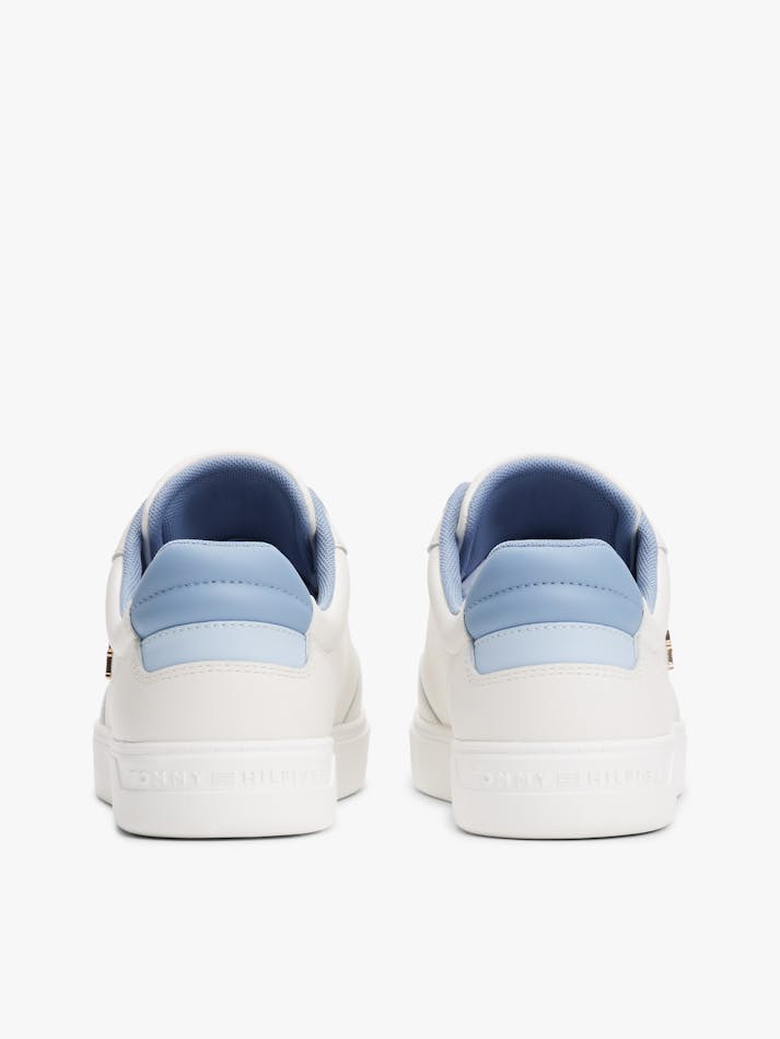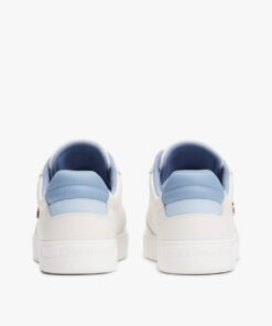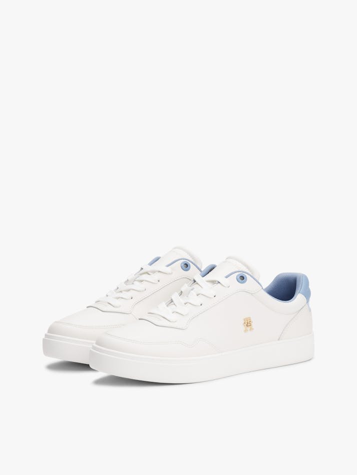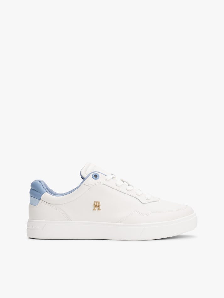 These elevated court trainers showcase gleaming plaque hardware with luxe leather uppers and a colour-pop design on the heels.