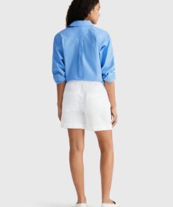 Crafted from a lightweight linen blend with an elasticated waistband and two side pockets, these shorts are perfect for easy summer styling. Finished with an enamel Tommy Hilfiger flag attached to the back pocket.
