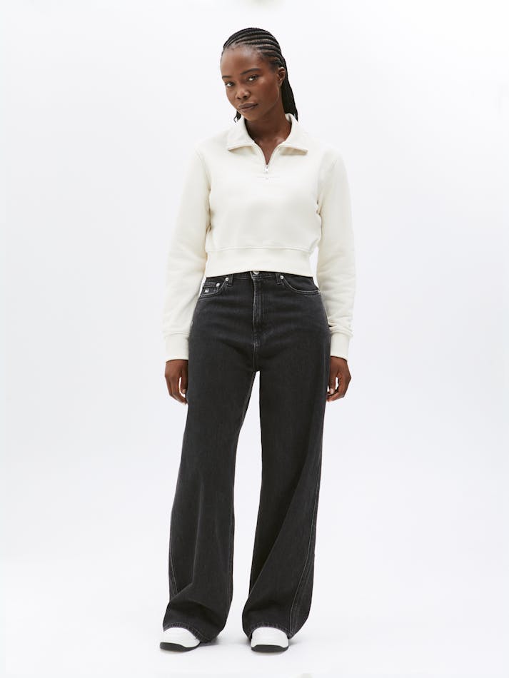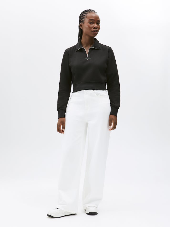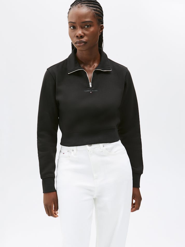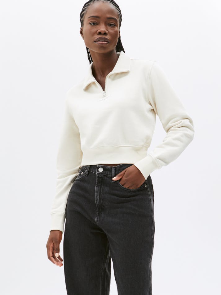 Keep your look clean and minimal with this 1/4 zip sweatshirt. Cut to a contemporary cropped fit with a mock neck, this jumper is finished with a tonal logo on the chest for a refined touch.