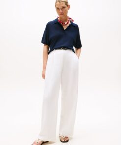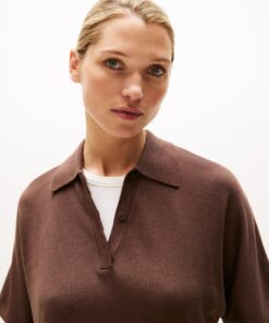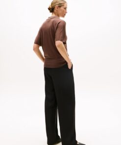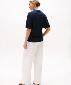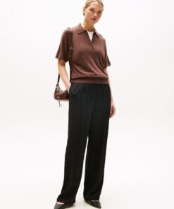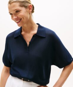 This short-sleeved polo jumper with silk in the fabric and metal flag branding is a luxe piece for your day-to-evening wardrobe.