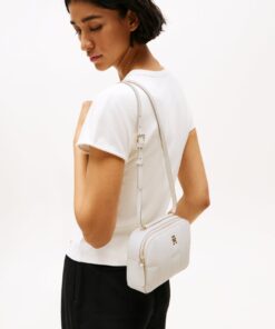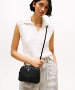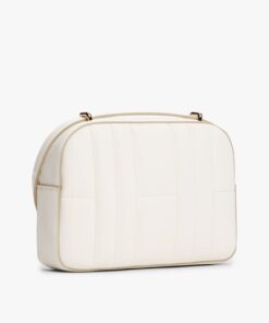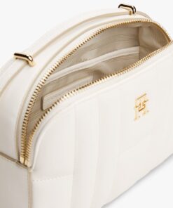 This clutch-style crossbody camera bag is compact yet luxurious with its plush quilted flag design and gleaming TH monogram plaque decoration.