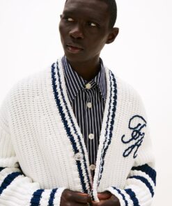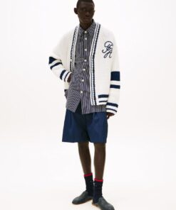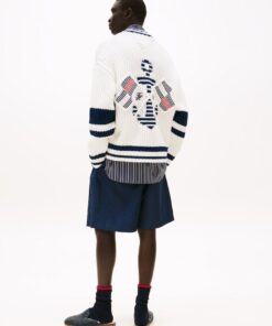 A new American prep wardrobe, presented at New York Fashion Week. Worn with oversized shorts, this slouchy knitted cardigan puts a fresh spin on nautical collegiate style with its logo on the back.