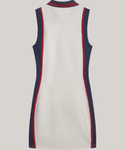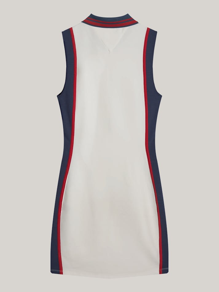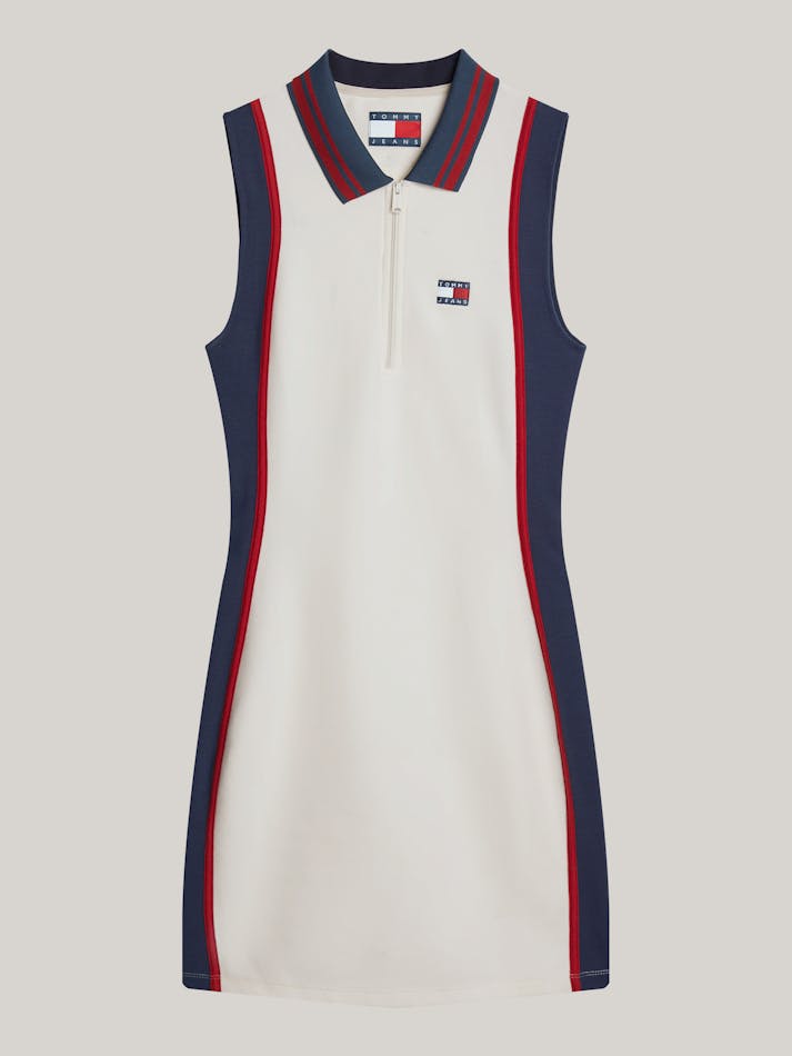 This fitted mini-length dress delivers retro-inspired sports styling thanks to side stripes and a contrast polo collar with a zipped neckline.