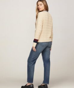 The all-over cable knit and signature stripe trims give this cardigan a varsity inspired feel. Crafted from pure cotton, this knit is finished with patch pockets and discreet Tommy branding.