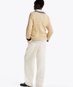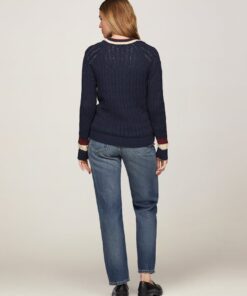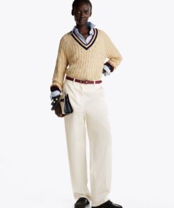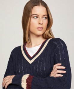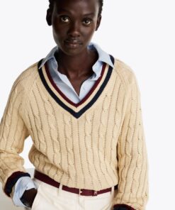With its v-neck, and striped rib knit trims, this cotton cable knit sweater delivers a varsity inspired vibe. Perfect for layering or wearing solo.