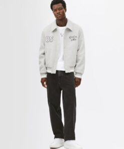 Featuring a spread collar and snap button closure, this cotton blend varsity jacket is complete with striped trims and a signature logo patch on the chest.
