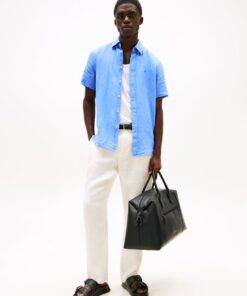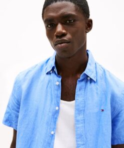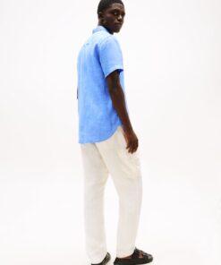 This pure linen shirt is pigment dyed for a lived-in look, and features short sleeves for a summery feel.